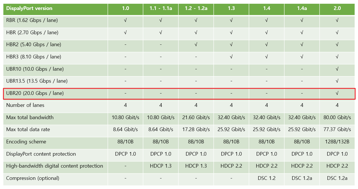 VESA DisplayPort standard 2.0의 경우 최대 20.0 Gbps / lane임을 알 수 있습니다.