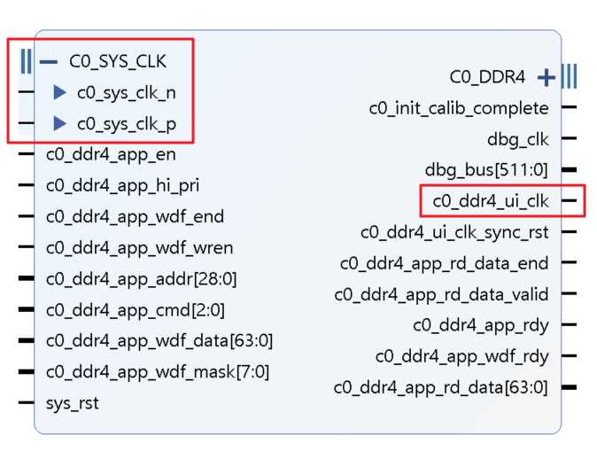 MIG IP는 아래의 그림과 같이 "c0_sys_clk_p/n"과 "c0_ddr4_ui_clk"이 있습니다.