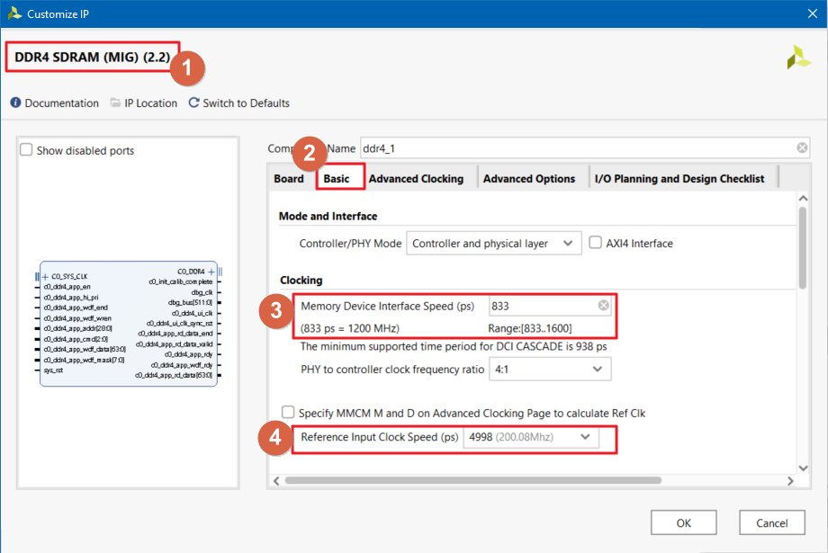 앞에서 설정한 값을 기준으로 "c0_sys_clk_p/n"은 Reference Input Clock Speed (ps)에 해당되며, 200 MHz가 됩니다.
