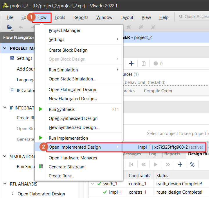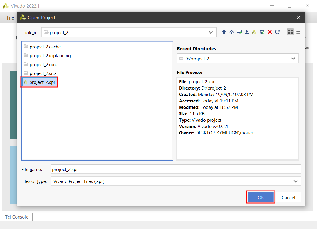 Vivado 2022.1에서 "project_2.xpr"파일을 Open Project 합니다.