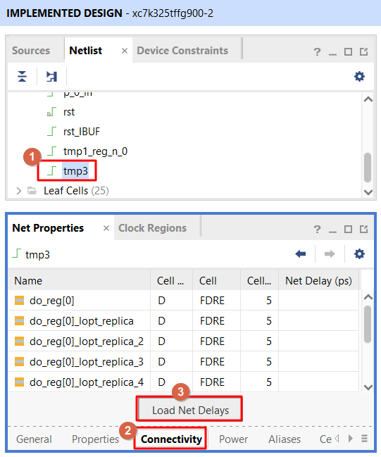 아래와 같이 "tmp3" Net를 클릭한 후, "Net Properties' 윈도우에서 "Connectivity" 탭을 클릭합니다, 그리고 "Load Net Delay" 버튼을 클릭합니다.