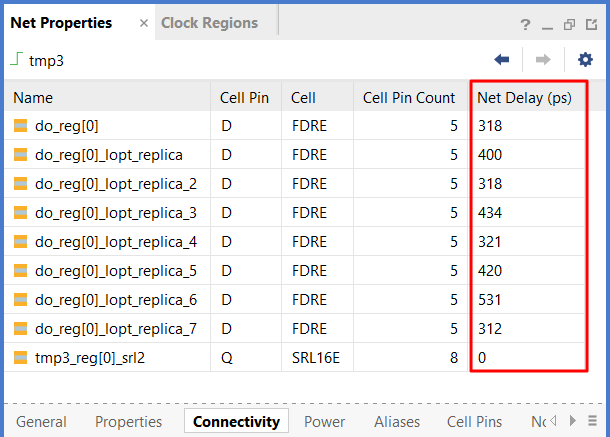 Vivado TCL console에서 다음과 같이 기입한 후, 엔터를 하면 "tmp3" Net가 가지고 있는 8 Fanout의 Net Delay 값을 알 수 있습니다. (아래의 net_delays은 변수명입니다.)