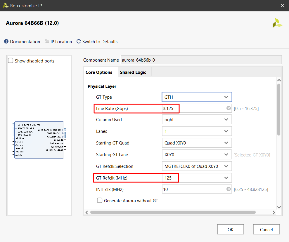 GTH를 사용하여 Aurora 64B/66B IP를 다음과 같은 설정으로 생성합니다.