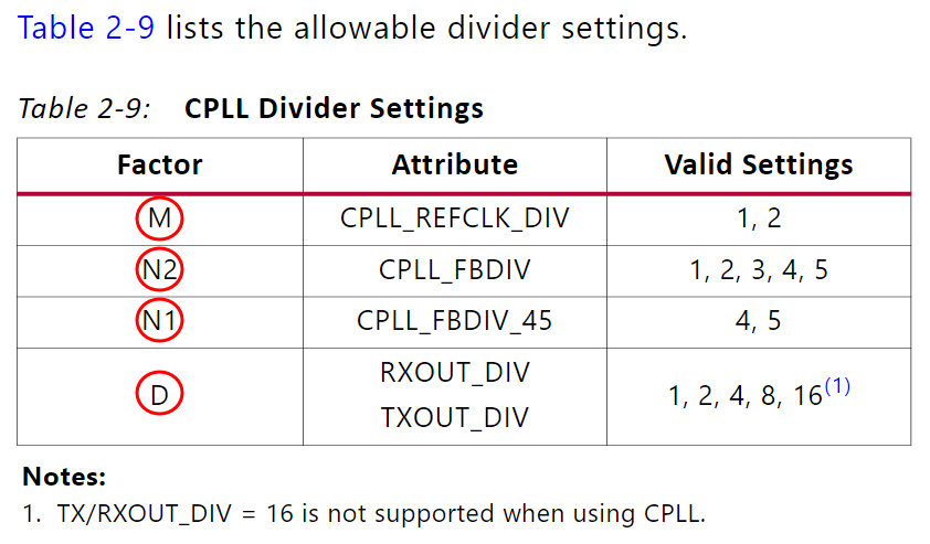 M, N2, N1, D의 값을 알기 위해서는 CPLL_REFCLK_DIV, CPLL_FBDIV, CPLL_FBDIV_45, RX/TXOUT_DIV의값을 확인하여야 합니다.