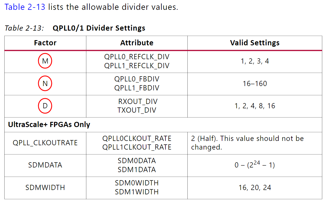 M, N, D의 값을 알기 위해서는 QPLL0/1_REFCLK_DIV, QPLL0/1_FBDIV, RX/TXOUT_DIV의 값을 확인하여야 합니다.