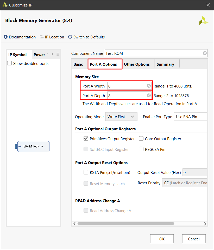 Port A Width, Port A Depth에 각각 8을 기입합니다.