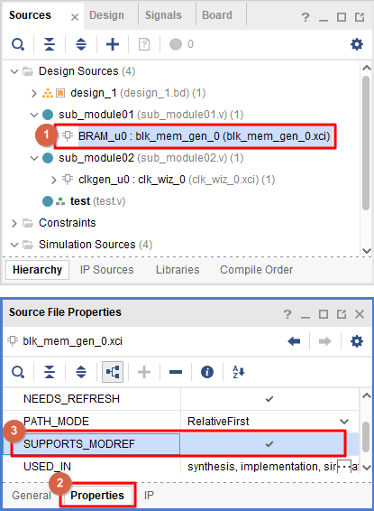 아래의 캡처화면을 보면 "sub_module01.v" 파일은 Xilinx IP인 BRAM을 포함하고 있습니다.