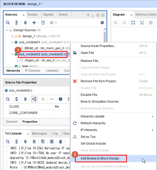 다음과 같이 Vivado의 Source 창에서 Xilinx Clock Wizard IP를 포함한 "sub_module02.v" 파일을 선택한 후, 마우스 오른 쪽 버튼을 클릭하면 "Add Module to Block Design"이라는 메뉴를 선택할 수 있습니다.