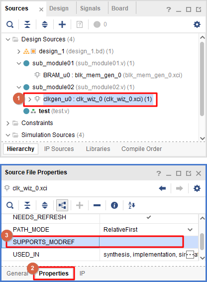 아래의 캡처화면을 보면 "sub_module02.v" 파일은 Xilinx IP인 Clock Wizard를 포함하고 있습니다.