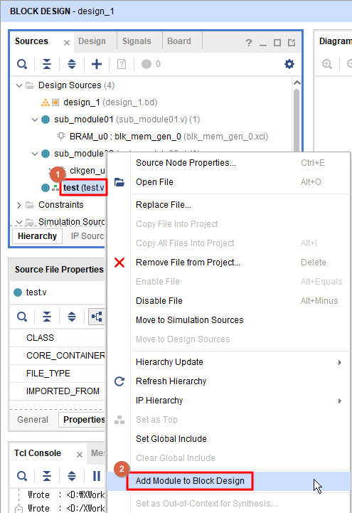 다음과 같이 Vivado의 Source 창에서 "test.v" 파일을 선택한 후, 마우스 오른 쪽 버튼을 클릭하면 "Add Module to Block Design"이라는 메뉴를 선택할 수 있습니다.