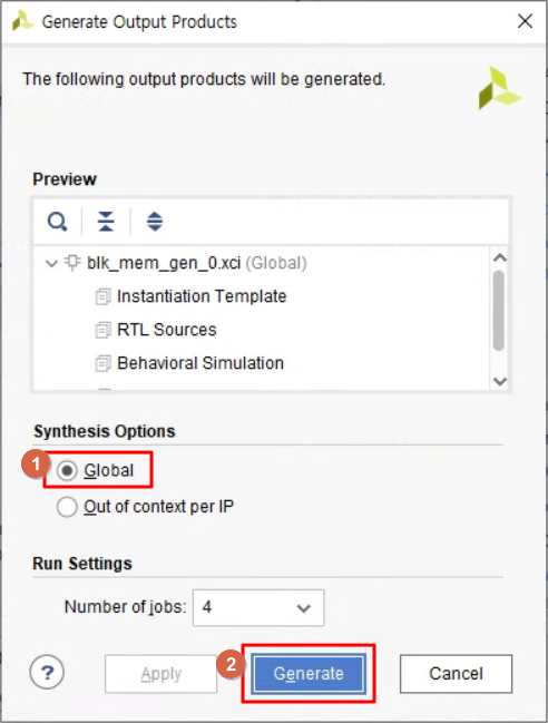 Xilinx IP가 포함된 RTL code의 경우도 "Add Module to Block Design"을 실행하면, Vivado의 Block Design에 사용할 수 있는 module로 생성될 수 있습니다. 다만 가능한 Xilinx IP가 있고 또한 불가능한 Xilinx IP도 있습니다. 그리고 반드시 Xilinx IP는 다음과 같이 Synthesis Options를 "Global"로 설정하여 생성하여야 합니다.