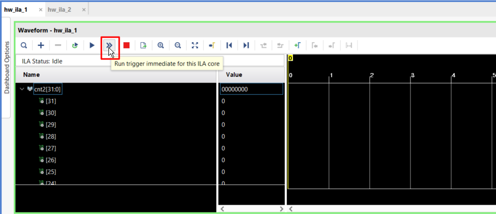 아래의 캡처 화면과 같이 "Run trigger immediate for this ILA core"를 클릭하여도 trigger된 파형이 보이지 않습니다.