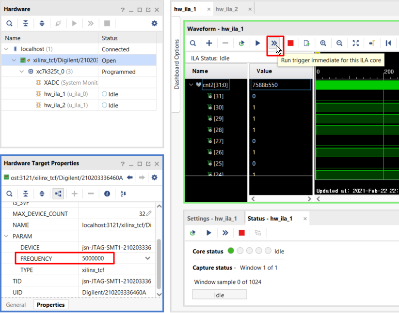 PARAM의 하위 메뉴에 있는 "FREQUENCY"의 value를 "5000000" (5 MHz)으로 변경한 후, "Run trigger immediate for this ILA core"를 클릭하면 trigger된 파형을 확인할 수 있습니다.
