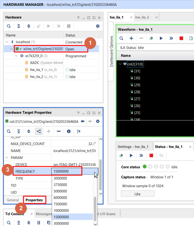 Vivado Hardware Manager의 ① download driver를 선택한 후, ② Hardware Target Properties에서 PARAM의 하위 메뉴에 있는 ③ "FREQUENCY"의 value가 "15000000" (15 MHz)으로 설정되어 있음을 확인할 수 있습니다.