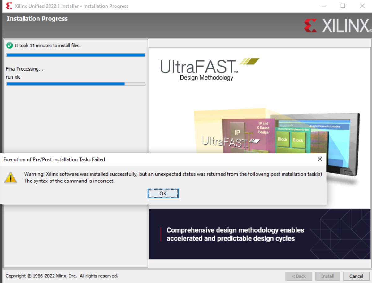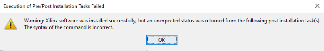 Warning: Xilinx software was installed successfully, but an unexpected status was returned from the following post installation task(s) The syntax of the command is incorrect.