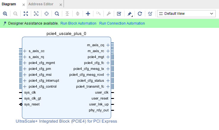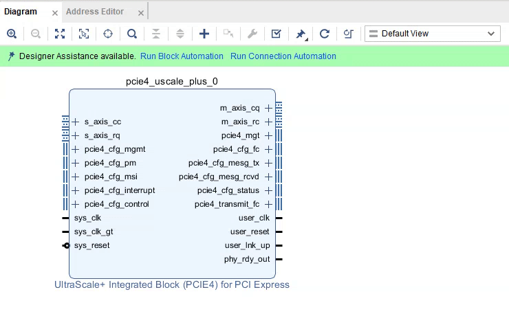 다음과 같이 Block Design에서 UltraScale+ Integrrated Block (PCIE4) for PCI Express의 Symbol을 확인할 수 있습니다.