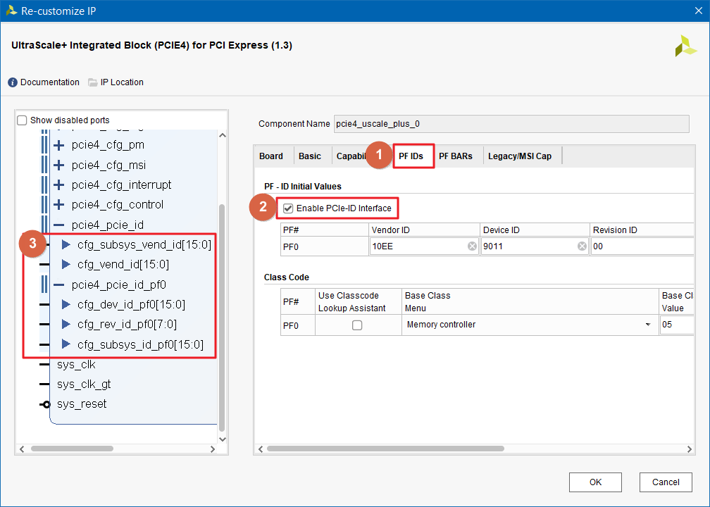 Xilinx UltraScale+ Devices Integrated Block for PCI Express를 사용하면 Vender ID, Device ID, Revision ID, Subsystem Vender ID, Subsystem Device ID를 변경할 수 있는 Option이 제공됩니다.