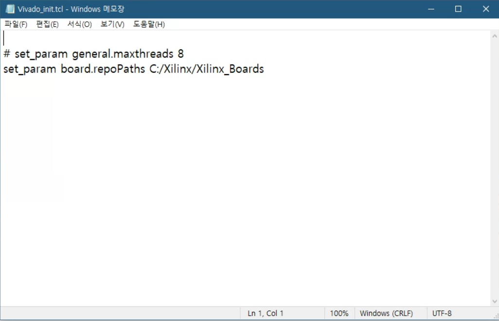 "Vivado_init.tcl" 파일을 메모장에서 열어 Vivado TCL Console에 입력하였던 command를 기입하고 저장합니다.